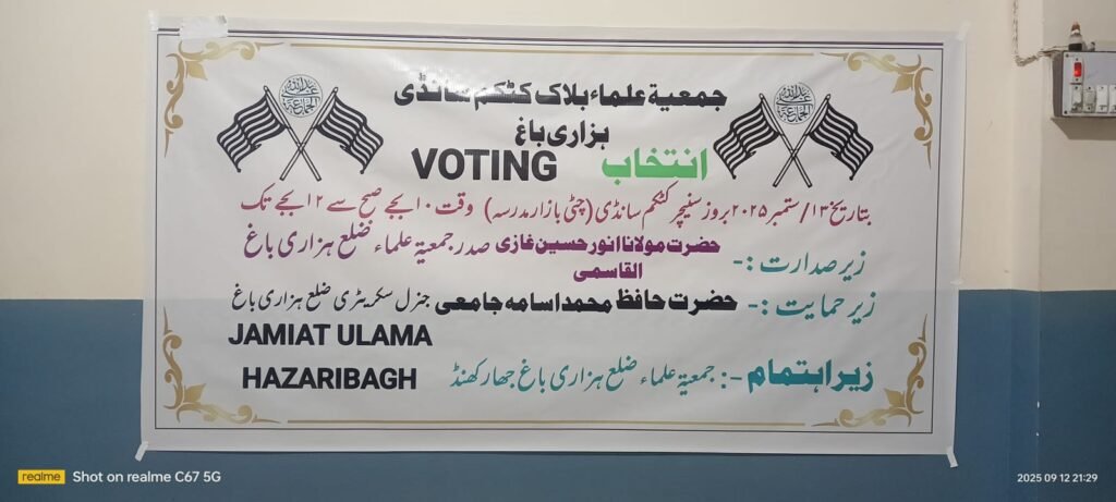 آج بتاریخ 20 / ربیع الاول 1447 ھ مطابق 13 ستمبر 2025 بمقام : مدرسه اسلاميه فيض العلوم ، کٹکم سانڈی میں جمعیتہ علماء بلاک کٹکم سانڈی کے انتخاب کے تعلق سے علماء و حفاظ اور دانشوران و معززین کی ایک مشترکہ نشست ہوئی ، جس جمعیتہ علماء ہزاری باغ کے صدر مولانا انور حسین غازی، جنرل سکر بڑی حافظ محمد اسامہ جامعی ، نائب صدور مولانا محمد موسی القاسمی و جناب ابو طلحہ ہاشمی اور ضلعی خازن مولانا ضیاء ارشد ندوی کی موجودگی میں انتخابی کارروائی عمل میں آئی ۔