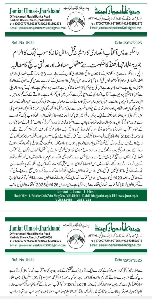 تھانے میں اس کو بیٹھایا گیا اسی دوران عرشی گارمنٹ کے مالکن نیہا سنگھ کے پوچھے جانے پر تھانے سے کوئی جانکاری نہیں دی گئی ۔ اسی دوران تھانہ والوں نے نیہا سنگھ کو رات گیارہ بجے گھر واپس بھیج دیا ۔ ایف آئی آر کے مطابق یہ واقعہ 23جولائی کا ہے ۔ اسی دوران آفتاب انصاری کے گھر والے تھانہ والوں سے رابطہ قائم کیا تو تھانہ انچارج نے گھر والوں کو بتایا کہ آفتاب انصاری تھانہ سے فرار ہو گیا ہے۔ اسی دوران 26جولائی 2025کو تھانہ والوں کی جانب سے اطلاع دی گئی کہ دامودر ندی کے کنارے ایک لاش پڑی ہے تحقیق کے بعد پتہ چلا کہ وہ آفتاب انصاری ہی کی لاش ہے ۔ یہ خبرملتے ہی پورے علاقے میں غم و اندوہ کا ماحول پیدا ہو گیا ۔ مولانا ڈاکٹر محمد اصغر مصباحی جنرل سکریٹری جمعیۃ علماء جھارکھنڈکی قیادت میںجمعیۃ علماءجھارکھنڈ ایک وفد 28جولائی 2025کو آفتاب انصاری کے گھرپہنچا اور صحیح صورت حال کا جائزہ لیا ۔ اور تمام حالات کی جانکاری لی ۔ وفد میں حاجی ظہیر الا سلام صاحب ، مولانا بدر عالم صاحب اور امتیاز صاحب کے علاوہ مقامی علمائے کرام موجود تھے ۔گھر والوں کے بیان کے مطابق اب تک سرکار اور انتظامیہ کی جانب سے کوئی مالی مدد نہیں دی گئی ہے ۔ اور اس وحشیانہ قتل کے ملزمین کی اب تک گرفتاری نہیں ہوئی ہے ۔ جو نہایت تشویش کن اور افسوسناک بات ہے ۔ البتہ جوملزمین کا سرغنہ ہے اور جس کی سازش کے تحت اس کو انجام دیا گیا ہےراجیش سنہا کی گرفتاری عمل میں آ چکی ہے ۔لیکن اس کا ساتھی دوسرا سرغنہ دیپک سسودھیا کی گرفتاری تا حال نہیں ہوئی ہے ۔ جمعیۃ علماء کا وفد متعلقہ علاقہ کے تھانہ انچارج انسپکٹر کرشنا کمار سے بھی صورت حال کی جانکاری لی ۔ اور اختر علی سب انسپکٹر سے بھی معلومات حاصل کی ۔ اور ان دونوں پولیس افسران سے مطالبہ کیا گیا کہ جلد از جلد تمام ملزمین جو اس واقعہ میں ملوث تھے جلد سے جلد ان کو گرفتار کیا جائے اور واقعی قرار سخت سے سخت سزا دی جائے ۔ جمعیۃ علماء کے وفد کی جانب سے آفتاب انصاری کی اہلیہ بیوہ صالحہ خاتون کو امداد کے طور پر ایک معقول رقم بھی دی گئی ۔ اس موقع پر مولانا ڈاکٹر محمد اصغر مصباحی ، حاجی ظہیر الا سلام صاحب ، مولان بدر عالم صاحب ، مولانا ابو بکر صاحب ، مولانا تنویر عالم صاحب ، جناب رستم علی صاحب ، جناب عامر سہیل صاحب ، جناب محمد شمشاد صاحب اور دیگر حضرات موجو دتھے ۔ جمعیۃ علماء جھارکھنڈ کی جانب سے جھارکھنڈ کی حکومت سے مطالبہ کیا گیا کہ آفتاب انصاری کے قتل میں ملوث ملزمین کو سخت سزا دی جائے ۔ سب کی گرفتاری کی جائے ۔ اور آفتاب انصاری کی بیوی صالحہ خاتون اور اس کے گھر والوں کو معقول معاوضہ دیا جائے ۔ اور اس سانحہ کی آزادانہ عدالتی جانچ کی جائے ۔ اور مظلوم کو حق و انصاف دلایا جائے ۔