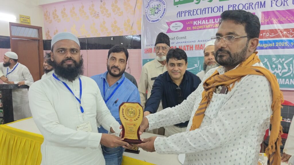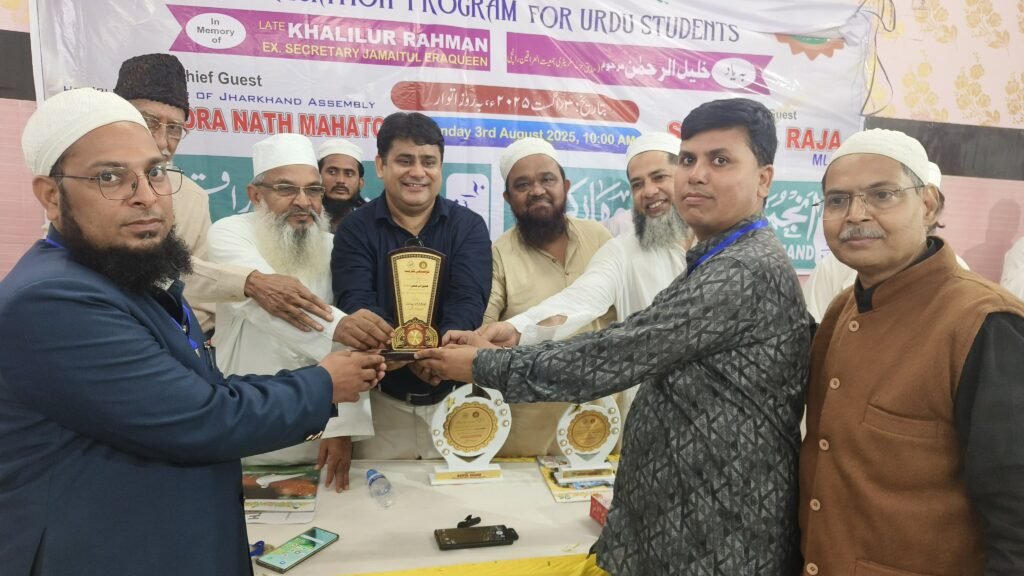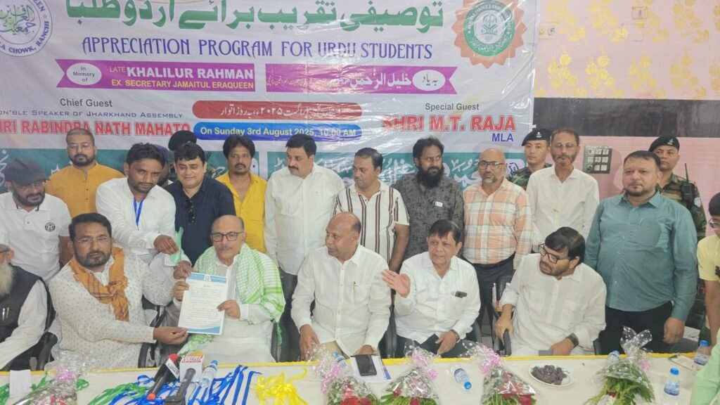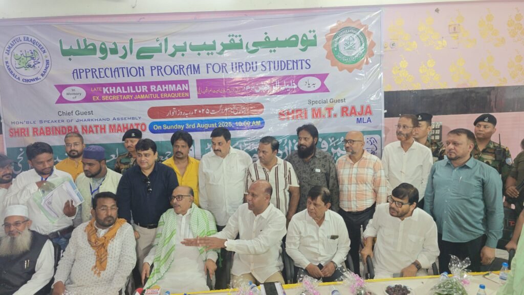 रांची: उर्दू भाषा एवं साहित्य, शिक्षा और सामाजिक जागरूकता के प्रचार-प्रसार में सक्रिय भूमिका निभाने वाले अंजुमन फरोग उर्दू झारखंड और जमीयतुल इराकीन रांची के द्वारा शनिवार, 3 अगस्त 2025 को उर्दू छात्रों के लिए सम्मान समारोह का आयोजन किया गया। जिसमें विभिन्न स्कूलों के 347 उर्दू छात्रों को सम्मानित किया गया। जिसमें हाल की परीक्षाओं में उत्कृष्ट सफलता प्राप्त करने वाले मैट्रिक और इंटरमीडिएट के विद्यार्थियों को सम्मानित और प्रोत्साहित किया गया। यह समारोह सुबह 10 बजे गुलशन मैरेज हॉल कर्बला चौक रांची में हुआ।