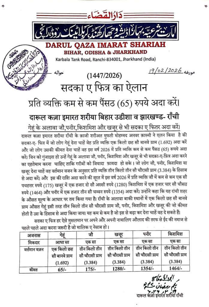 दारूल कज़ा इमारत शरीया राँची के क़ाजी शरीअत मुफती मोहम्मद अनवर क़ास्मी ने एलन किया है की सदका-ए- फित्र में जो लोग गेहूं देना चाहें वेह प्रति व्यक्ति एक किलो छह सौ बानवे ग्राम (1.692) अदा करें ओैर जो लोग उसकी कीमत देना चाहें वह इस वर्ष 2026 में प्रति व्यक्ति कम से कम पैंसठ (65/-) रूपये अदा करें। जिन को गुंजाइश हो उन्हें गेहूं के अलावा जौ, पनीर, किशमिश और खजूर से भी सदक़ा-ए-फ़ित्र अदा करने का एहतेमाम करना चाहिए ताकि गरीबों को जियादा फ़ायदा हो सके । जो लोग जौ, पनीर, किशमिश या खजूर देना चाहें वह वर्तमान वजन के अनुसार प्रति व्यक्ति तीन किलो तीन सौ चौरासी ग्राम (3.384) के हिसाब से अदा करें। ओैर इस की राशि अदा करने की सूरत में इस वर्ष 2026 में प्रति व्यक्ति जौ में कम से कम एक सौ पचहत्तर रुपये (175/-) खजूर में एक हजार दो सौ अस्सी रुपये (1280/-) किशमिश में एक हजार चार सौ चौसठ रुपये (1464/-) और पनीर में एक हजार तीन सौ चव्वन रुपये (1354/-) अदा करें। उन्होंने कहा कि यह रांची शहर के औसत मूल्य के आधार पर तय किया गया है। राँची के अलावा बाकी स्थानों में एक किलो छह सौ बानवे ग्राम औसत गेहूं इसी तरह तीन किलो तीन सौ चौरासी ग्राम जौ, पनीर, किशमिश और खजूर की जो कीमत होती है उस के हिसाब से अदा किया जाय। यह कम से कम है जो इस से बढ़ा कर देना चाहें वह दे सकते हैं।