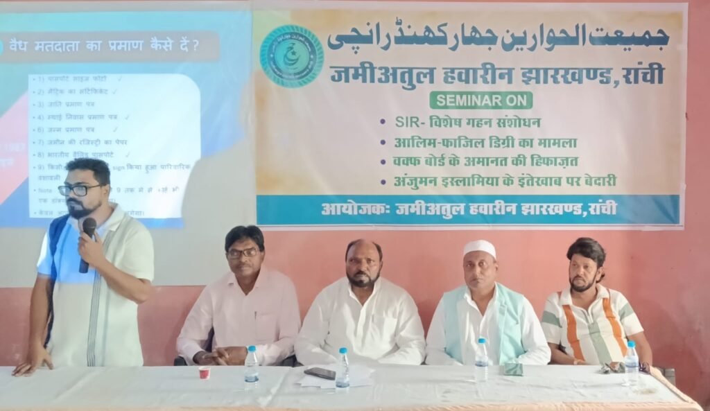 जमीअतुल हवारीन झारखंड के तत्वावधान में कर्बला चौक स्थित काम्यूनिटी हाल में एकदिवसीय सेमीनार आयोजित की गई जिसकी अध्यक्षता जमीअतुल हवारीन झारखंड के अध्यक्ष मो. इसलाम ने की।मो. इसलाम ने अपने सम्बोधन में सेमीनार के मूल उद्देश्य पर प्रकाश डालते हुए एस.आई. आर( गहन मतदाता पुनरीक्षण), वक्फ के मिल्कियत की हिफाजत,आलिम- फाजिल डिग्री का मामला एवं अंजुमन इस्लामिया रांची के होने वाले चुनाव के लिए आम लोगों में जागरूकता लाना एवं अपने संवैधानिक हक के लिए आगे आना ही इस सेमिनार का मूल उद्देश्य है से सम्बंधित मूल बातें कही। उन्होंने अपने हक की आवाज बुलंद करने पर बल देते हुए समाज के हर वर्ग को आगे आने का आह्वान किया।