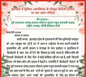 ایرانی سربراہ آیۃ اللہ سیدخامنہ ائ کو شھید کرنا دنیاے انسانیت کے لیئے بڑالمحہ فکریہ۔ ادارہ شرعیہ جھارکھنڈMarch 1, 2026March 1, 2026