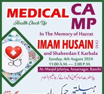 Blogहज़रत इमाम हुसैन और शहीदान ए कर्बला की याद में चिकित्सा स्वास्थ्य जांच शिविर 04/अगस्त/2024 कोKhabar OnlyAugust 1, 2024August 1, 2024रांची:- अंजुमन-ए-जाफरिया द्वारा मस्जिद-ए-जाफरिया में 04 अगस्त 2024 को सुबह 11 बजे से अंसार नगर चर्च रोड विक्रांत चौक रांची...