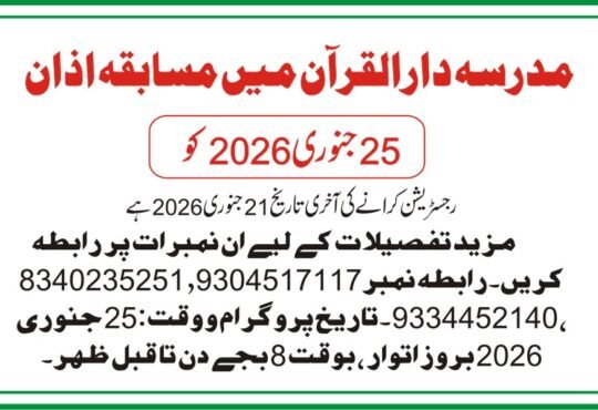 All India NewsBlogJharkhand NewsNewsRanchi JharkhandRanchi Jharkhand NewsRanchi Newsمدرسہ دارالقرآن میںمسابقۂ اذان، بیادگارحضرت بلالِ حبشیؓ 25 کوKhabar OnlyJanuary 14, 2026January 14, 2026