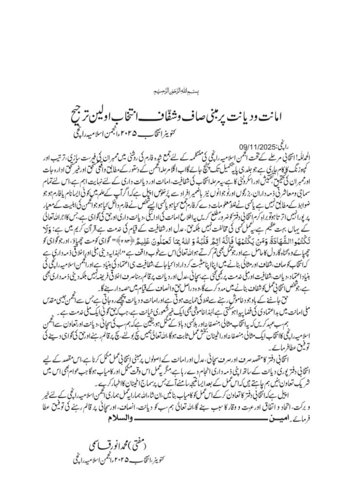 الحمدللّٰہ! انتخابی مرحلے کے تحت انجمن اسلامیہ رانچی کی منتظمہ کے لئے جمع شدہ فارم کی روشنی میں ممبران کی فہرست سازی، ترتیب اور کمپوزنگ کا کام جاری ہے جو جلد ہی پایہ تکمیل تک پہنچ جائے گا اب اگلا مرحلہ انجمن کے دستور کے مطابق واقعی مستحق اور غیر مستحق ادارہ جات اور ممبران کی تحقیق و تفتیش اور اسکروٹنی کا ہے،یہ مرحلہ انتخاب کی شفافیت، امانت اور دیانت داری کے لئے نہایت اہم ہے،اس لئےتمام سماجی و معاشرتی ذمہ داران، بزرگوں اور نوجوانوں نیز باضمیر افراد سے پُر خلوص اپیل ہے کہ اگر آپ کے علم میں کوئی ایسا نام یا فارم ہو جو ضوابط کے مطابق نہیں ہے یا کسی نے غلط معلومات دے کر فارم جمع کیا ہویا کسی ایسے شخص نے فارم داخل کیا ہو جو انجمن کی اہلیت کے معیار پر پورا نہیں اترتا ہو تو براہِ کرم انتخابی دفتر کو ضرور مطلع کریں یہ اطلاع امانت کی ادائیگی، دیانت داری اور حق کی گواہی ہے، جس کا اجر اللہ تعالیٰ کے یہاں بہت عظیم ہے،یہ عمل کسی کی مخالفت نہیں بلکہ حق، عدل اور شفافیت کے قیام کی خدمت ہے