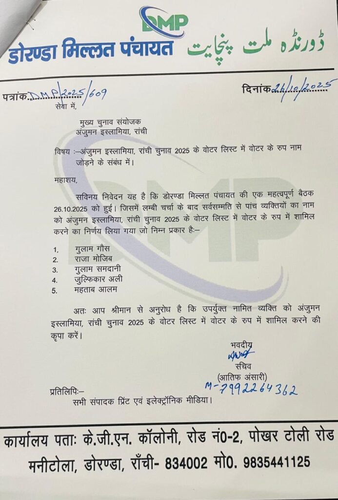 अंजुमन चुनाव को लेकर डोरंडा मिल्लत पंचायत कमिटी कि बैठक में निर्णय