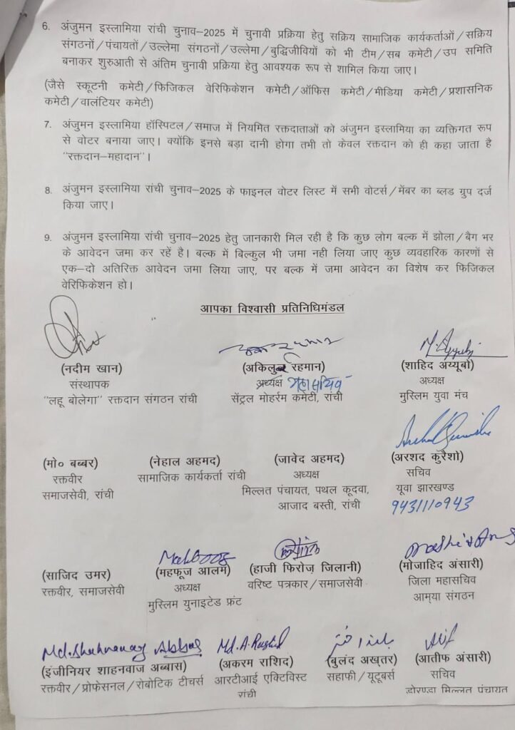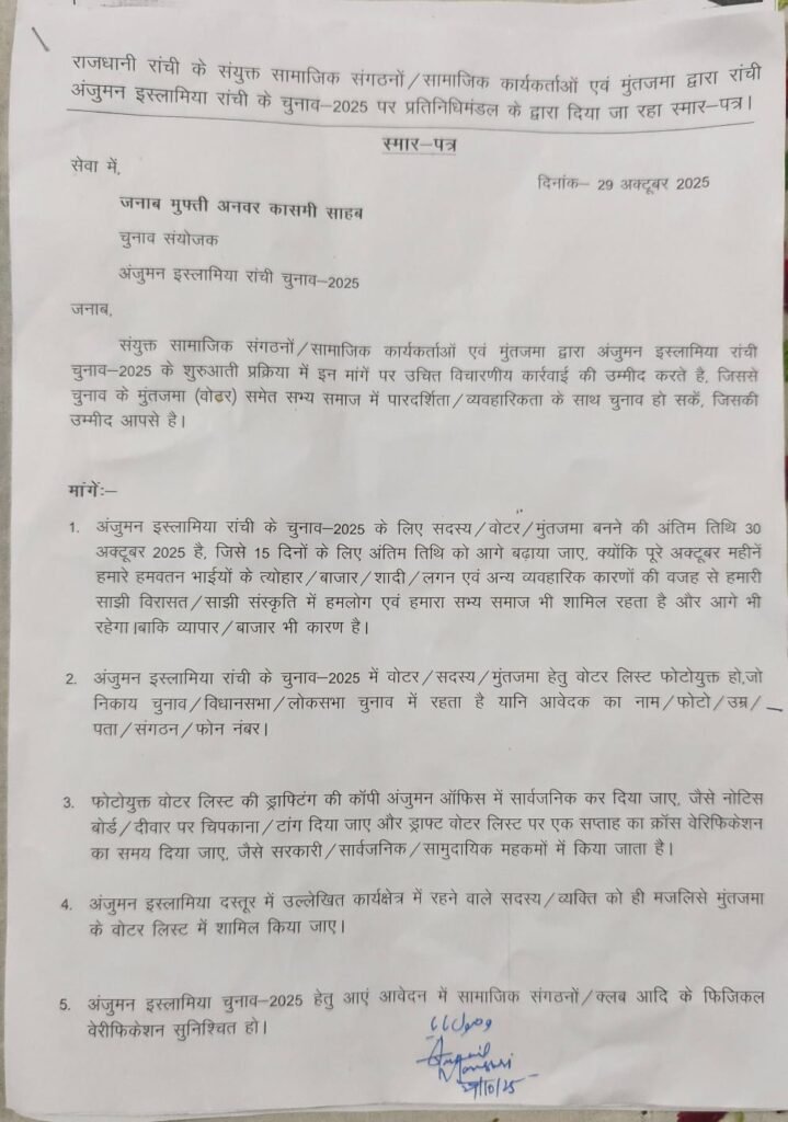अंजुमन इस्लामिया रांची चुनाव-2025 वोटर बनने की अंतिम तिथि 15 दिन के लिए बढ़ाई जाए…संयुक्त सामाजिक संगठनों/समाजसेवियों