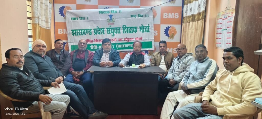 झारखण्ड प्रदेश संयुक्त शिक्षक मोर्चा की एक राज्य स्तरीय बैठक उच्च न्यायालय द्वारा शिक्षकों के वर्षों से लंबित उत्क्रमित वेतनमान दिये जाने के आदेश के सिलसिले में भारतीय मजदूर संघ के कार्यालय में हुई। बैठक की अध्यक्षता महासंघ के प्रांत संयोजक आशुतोष कुमार तथा संचालन मोर्चा के प्रदेश संयोजक अमीन अहमद के द्वारा किया गया।