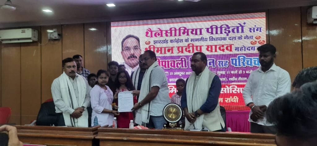 आज झारखंड के थैलेसीमिया/सिकल सेल एवं अप्लास्टिक एनीमिया के पीड़ित बच्चों/परिजनों संग झारखंड कांग्रेस के माननीय विधायक दल के नेता एवं मुख्य अतिथि श्रीमान प्रदीप यादव जी के साथ दीपावली मिलन एवं परिचर्चा का आयोजन झारखंड थैलेसीमिया पीड़ित एसोसिएशन(A यूनिट ऑफ़ “लहू बोलेगा” रक्तदान संगठन रांची) ने झारखंड विधानसभा सभागार रांची में हुआ।