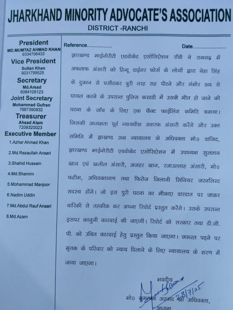 रांची: झारखण्ड माईनोरीटी एडवोकेट एसोसिऐशन राँची ने रामगढ़ में अफताफ अंसारी को हिन्दू टाईगर फोर्स के लोगों द्वारा नेहा सिंह के दुकान से घसीटकर बुरी तरह सह पीटने और गंभीर रूप से घायल करने के उपरान्त पुलिस कस्टडी में उसकी मौत हो जाने की घटना के जाँच के लिए एसोसिएशन के अध्यक्ष मुमताज़ अहमद खान ने एक फैक्ट फाईलिंग कमिटि बनाया।