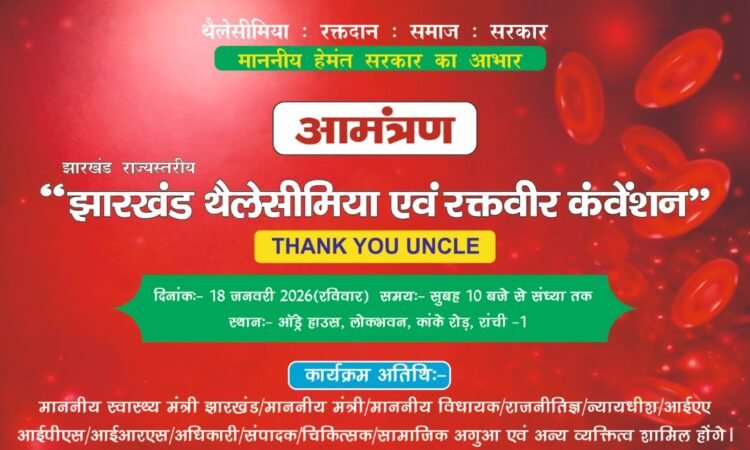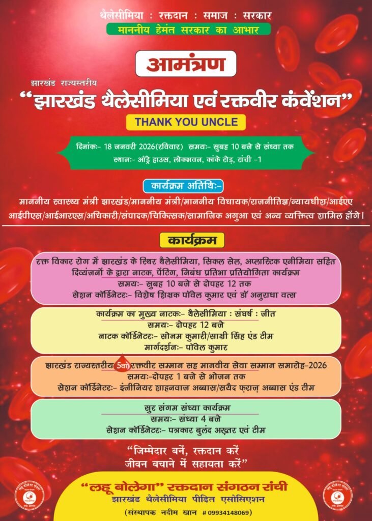 रांची: आज दिनांक 16 जनवरी 2026 को लहू बोलेगा रक्तदान संगठन रांची एवं झारखंड थैलेसीमिया पीड़ित एसोसिएशन के द्वारा थैलेसीमिया, रक्तदान, समाज एवं सरकार के संदर्भ पर थैंक्स यू अंकल के साथ माननीय हेमंत सरकार का आभार प्रकट के करते हुए झारखंड राज्यस्तरीय स्टैबल थैलेसीमिया-सिकल सेल एनीमिया, अप्लास्टिक एनीमिया पीड़ितों एवं दिव्यंजनों के द्वारा प्रतिभा,मनोरंजन पर आधारित पेंटिंग/नाटक/क्राफ्ट/गीत संगीत का प्रतियोगिता सहित 5 वां रक्तवीर सम्मान सह मानवीय सेवा सम्मान-2026 एवं राजधानी रांची के प्रोफेशनल संगीतकारों/तबलावादक/बाँसुरी वादक द्वारा सुर संगम संध्या का झारखंड राज्यस्तरीय आयोजन ऑड्रे हॉउस,रांची में चार सेशन में कंवेंशन आयोजित है। कार्यक्रम में मुख्य अतिथि झारखंड सरकार के माननीय स्वास्थ्य मंत्री डॉ इरफ़ान अंसारी,झारखंड कांग्रेस विधायक दल के माननीय नेता प्रदीप यादव,माननीय विधायक अरुप चटर्जी,माननीय पूर्व विधायक विनोद सिंह,माननीय सांसद एवं कई माननीय मंत्री,विधायक,पद्मश्री मधु मंसूरी,आईएएस,आईपीएस,चिकित्सक,इंजीनियर,विभागीय अधिकारी,प्रशासनिक अधिकारी,संपादक, सामाजिक अगुआ एवं अन्य व्यक्तित्व शामिल होंगे। यह आयोजन सुबह 10 से संध्या तक चलेगा। उक्त जानकारी लहू बोलेगा के संस्थापक नदीम खान और युवा समाजसेवी सैयद फराज अब्बास ने दी है।