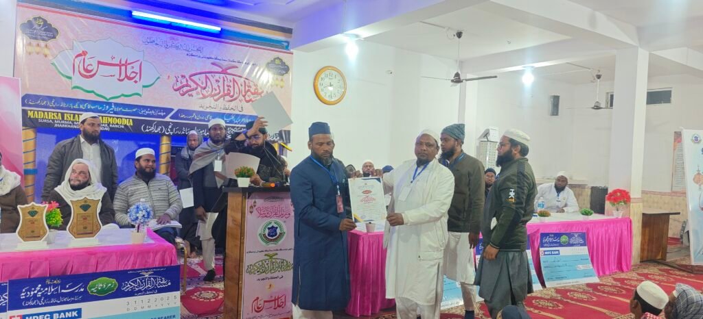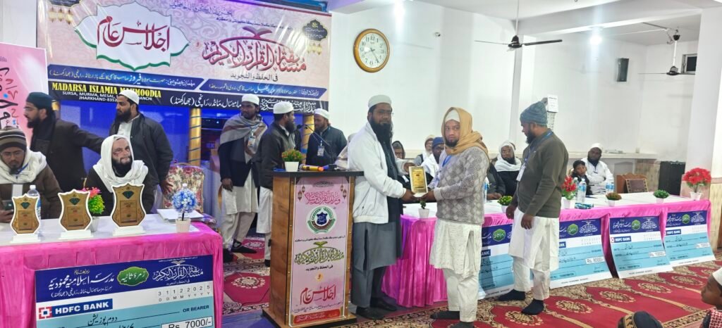 رانچی: مدرسہ اسلامیہ محمودیہ سرسا مڑما میسال میں یک روزہ عظیم الشان مسابقۃ القرآن الکریم الحفظ والتجوید آج تین نشستوں میں منعقد ہوا۔ نشست اول بوقت صبح 7تا 11 بجے و نشست ثانی 11سے ظہر تک، نشست ثالثہ ظہر تا عصر منعقد ہوا۔ اس مسابقتہ القرآن الکریم میں 6 اضلاع کے 32 مدارس شامل ہوئے۔ مسابقہ کے کنوینر حضرت مولانا طہ تھے۔ ممتحن حضرت مولانا محمد اللہ قاسمی، حکم حضرت مولانا توفیق آفندی الرشیدی، حکم حضرت مولانا قاری توصیف الرشیدی، حکم حضرت مولانا مفتی احتشام الحق قاسمی، استاذ الاساتذہ حضرت مولانا قاری صہیب احمد، مسابقہ کے نگراں حضرت مولانا مفتی احمد بن نذر، حضرت مولانا مفتی محمد بن نذر، حضرت مولانا مفتی احرار تھے۔