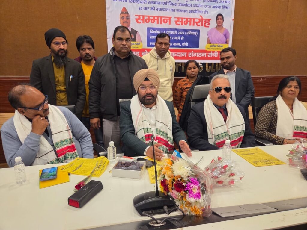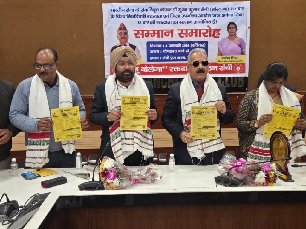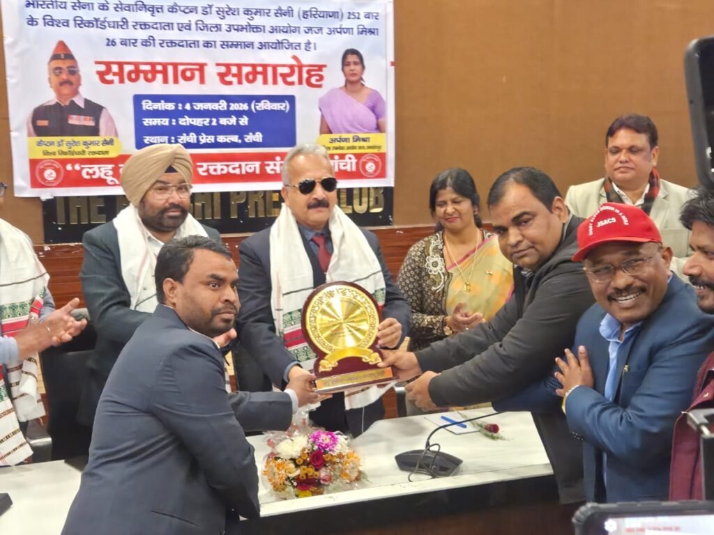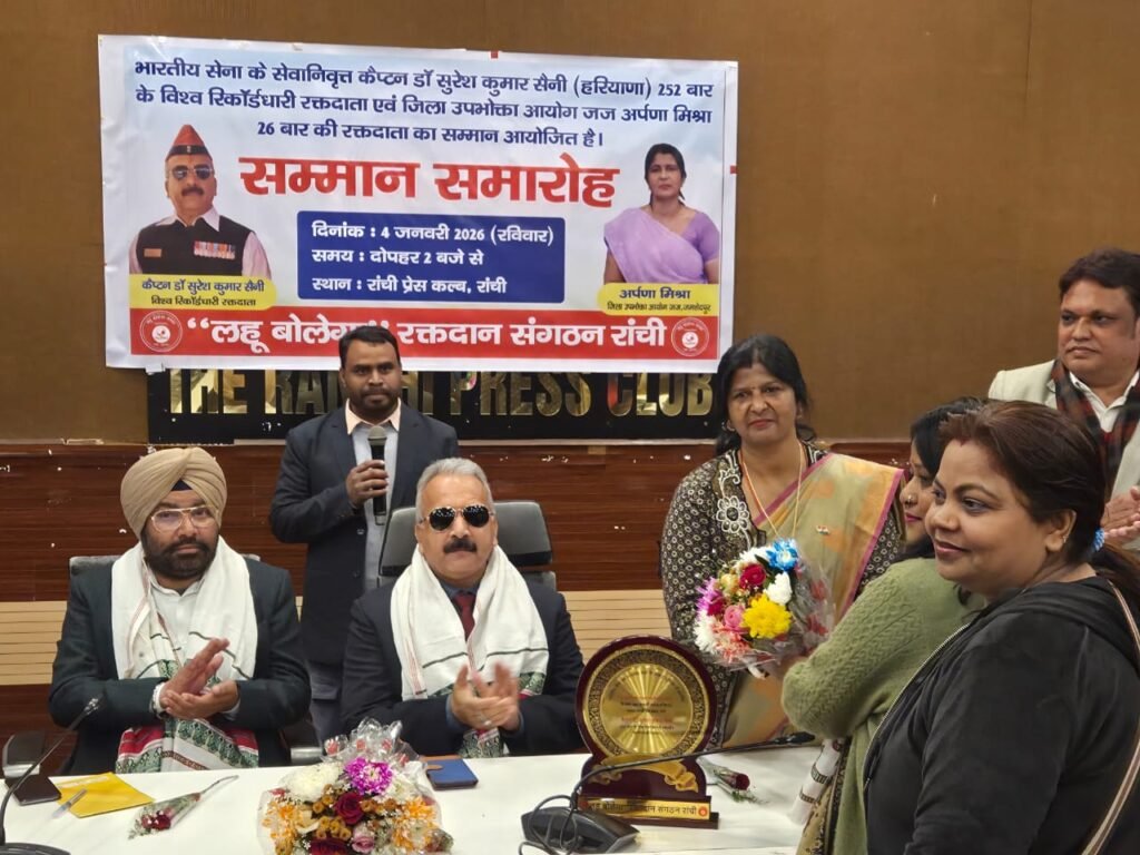 भारतीय सेना के सेवानिवृत्त कैप्टन एवं उत्कृष्ट मानवीय सेवा की भूमिका में समर्पित रक्तवीर कैप्टन डॉ सुरेश कुमार सैनी(252 बार के विश्व रिकॉर्डधारी रक्तदाता),करनाल,हरियाणा एवं जिला उपभोक्ता आयोग जज,जमशेदपुर की श्रीमति अर्पणा मिश्रा,26 बार की रक्तदाता सहित भारतीय प्रशासनिक सेवा एवं उत्कृष्ट मानवीय सेवा की भूमिका में समर्पित रक्तवीर श्रीमान आईएएस उत्कर्ष कुमार के सम्मान में आज रांची प्रेस क्लब में “लहू बोलेगा” रक्तदान संगठन रांची द्वारा दोपहर में आयोजित हुआ।जिसमें इन व्यक्तित्व का सम्मान किया गया।