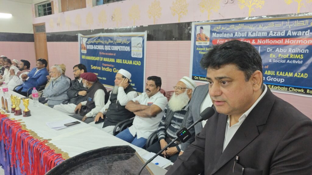 सर्व इंडिया ग्रुप ने मौलाना आजाद डे पर भाषण प्रतियोगिता एवं क्विज प्रतियोगिता का आयोजन शहर के मुख्तलिफ स्कूलों में किया, प्रतियोगिता में जीत हासिल करने वाले छात्र-छात्राओं को आज सम्मानित किया गया प्रोग्राम का आयोजन जामियतुल इराकीन बिल्डिंग कर्बला चौक रांची में हुआ जिसके अध्यक्षता हसीब अख्तर ने की प्रोग्राम का निजामत सैफ उल हक और सरवर खान ने किया। लगभग 15 स्कूल के 400 छात्र छात्राओं ने इस प्रोग्राम में हिस्सा लिया। दो कैटेगरी में प्रोग्राम प्राइमरी और सेकेंडरी लेवल पर बांटा गया था। प्राइमरी लेवल पर शाहिद फातिमा पैरामाउंट स्कूल प्रथम स्थान, शगुफ्ता परवीन सेकंड स्थान, जैनब परवीन तीसरा स्थान,। सेकेंडरी लेवल पर प्रथम स्थान आतिक फिरदौस, रयान अमीन द्वितीय एवं आमदनी नाज तृतीय स्थान हासिल किया। भाषण में राईन स्कूल बढ़िया प्रवीण,मिल्लत अकादमी असद आदिलऔर ड्रीम लाइन स्कूल के अलीना परवेज ने कामयाबी हासिल की।