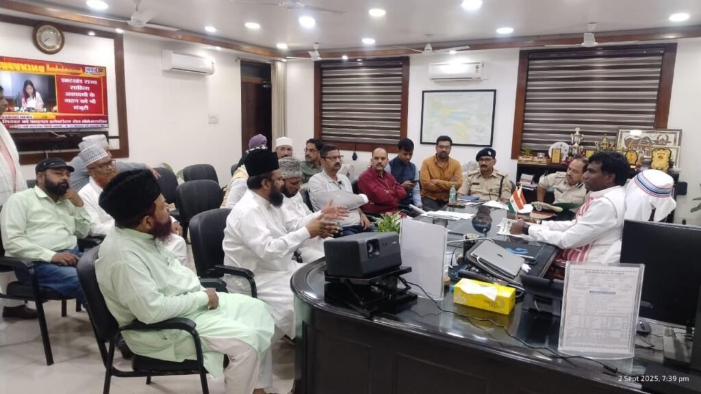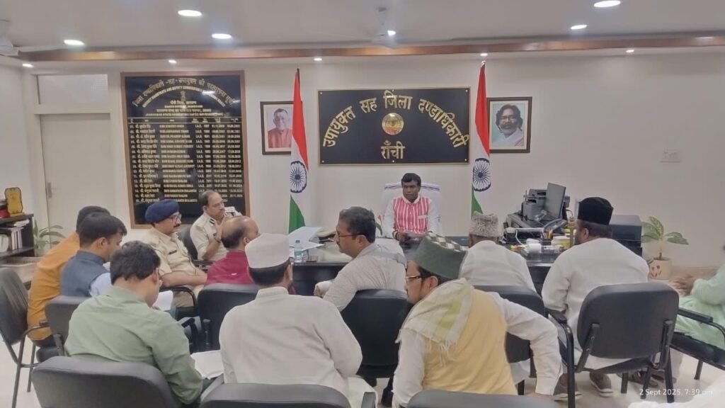 जश्न-ए-ईद मिलादुन्नबी के अवसर पर शांति, सौहार्द्र एवं सुव्यवस्थित माहौल में पर्व संपन्न कराने हेतु आज दिनांक 02.09.2025 को उपायुक्त-सह-जिला दंडाधिकारी, रांची श्री मंजूनाथ भजन्त्री की अध्यक्षता में शांति समिति की बैठक आयोजित की गई। बैठक में वरीय पुलिस अधीक्षक, रांची श्री चंदन सिन्हा, अपर जिला दंडाधिकारी (विधि-व्यवस्था) श्री राजेश्वरनाथ आलोक, अनुमंडल पदाधिकारी रांची, सदर श्री उत्कर्ष कुमार, पुलिस अधीक्षक नगर श्री अजीत कुमार एवं शांति समिति के सदस्य उपस्थित थे।
