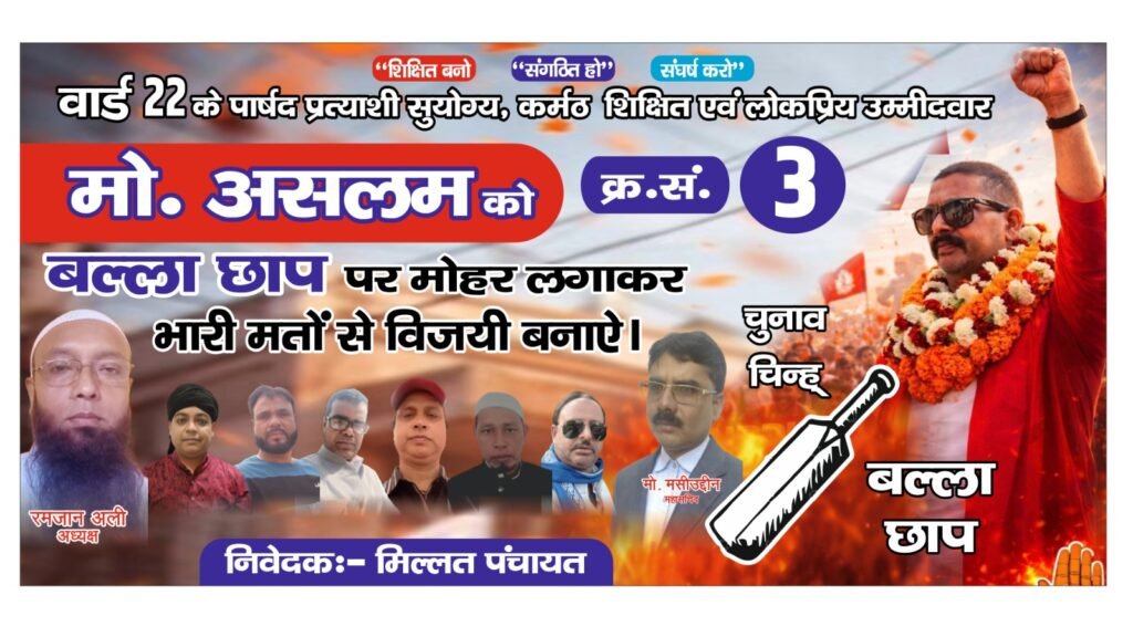 ان مسائل کا مستقل حل تلاش کرنے کے لیے مرحلہ وار ایکشن پلان کے ساتھ کام کرنے کے لیے وارڈ 22 کے امیدوار محمد اسلم پرعزم ہے۔انہوں نے بزرگ شہریوں، خواتین اور نوجوانوں کے لیے کمیونٹی سہولت مراکز اور عوامی سماعت کا نظام شروع ہے جسے اور بھی بہتر بنانے کا وعدہ کیا ہے۔ندیم اقبال نے کہاکہ محمد اسلم ایک ایسا شخص ہے جو اپنا وارڈ کے لئے سب کچھ نچھاور کرنے کو تیار ہے۔نگم میں لڑ کر کام نکالنے کا ہنر محمد اسلم جانتے ہیں۔ندیم اقبال نے وارڈ نمبر 22 کے ووٹروں سے اپیل کی کہ وہ میونسپل کارپوریشن انتخابات میں بلا چھاپ انتخابی نشان سیریل نمبر3 پر اپنا قیمتی ووٹ ڈال کرمحمد اسلم کو کامیاب بنائیں اور وارڈ کی ہمہ گیر ترقی میں اپنی شرکت کو یقینی بنائیں۔