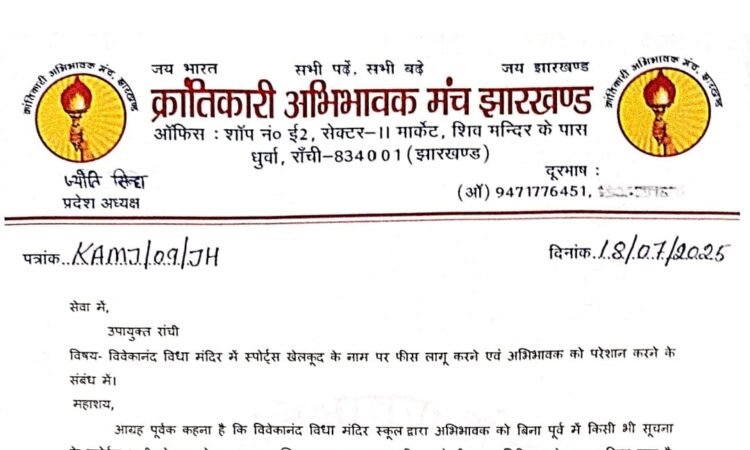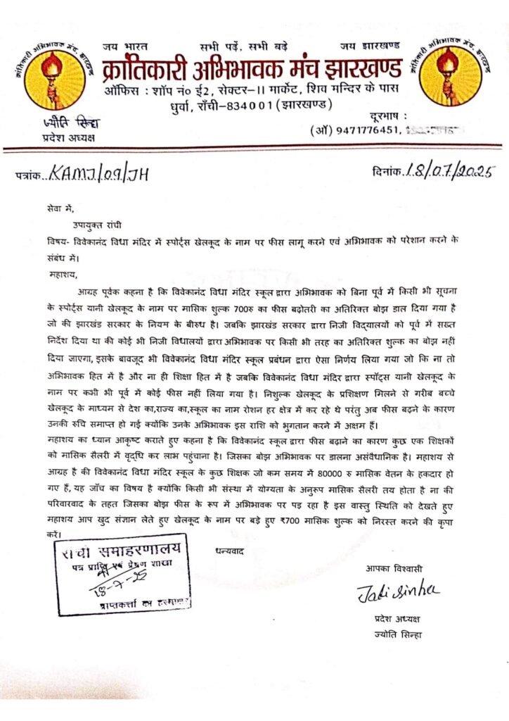 रांची। स्कूल-कॉलेज के छात्रों के हितों के संरक्षण हेतु गठित संस्था “क्रांतिकारी अभिभावक मंच” ने एचईसी परिसर स्थित विवेकानंद विद्या मंदिर स्कूल प्रबंधन द्वारा स्पोर्ट्स फी (खेलकूद शुल्क) के नाम पर अभिभावकों से प्रतिमाह सात सौ रुपए वसूले जाने को अनुचित ठहराते हुए इस संबंध में उपायुक्त को ज्ञापन सौंपा है।