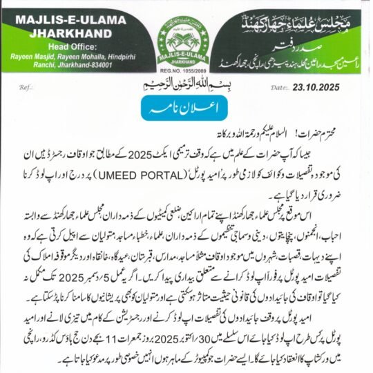 امارت شرعیہ کی میٹینگ میںجھارکھنڈ سرکارکے تعلیم مخالف فیصلے پر گہری تشویشOctober 22, 2025October 22, 2025